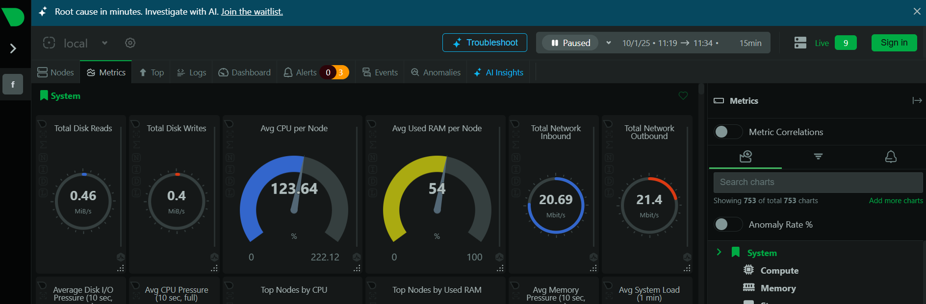 Each child has no local DB, but still collects apps and cgroups for useful per-process and container stats. We cap the container at 0.5 CPU and 512 MB RAM.
